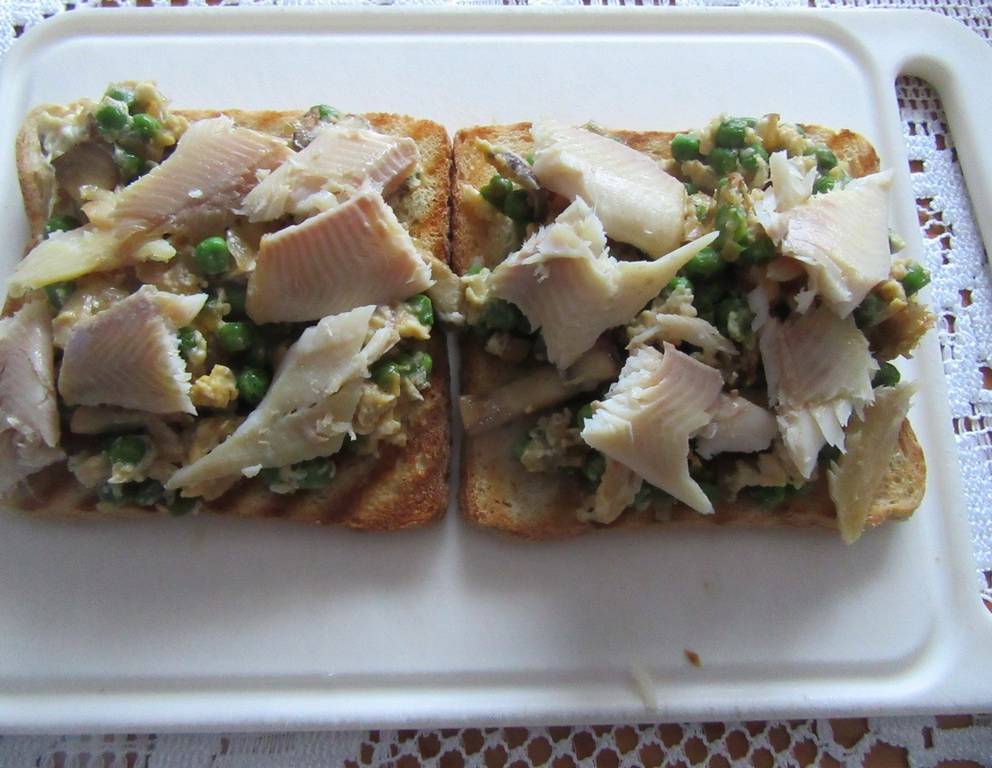 - Die Toastscheiben toasten und die Champignons-Erbsen-Eiermischung darauf verteilen. Mit der Forelle belegen.