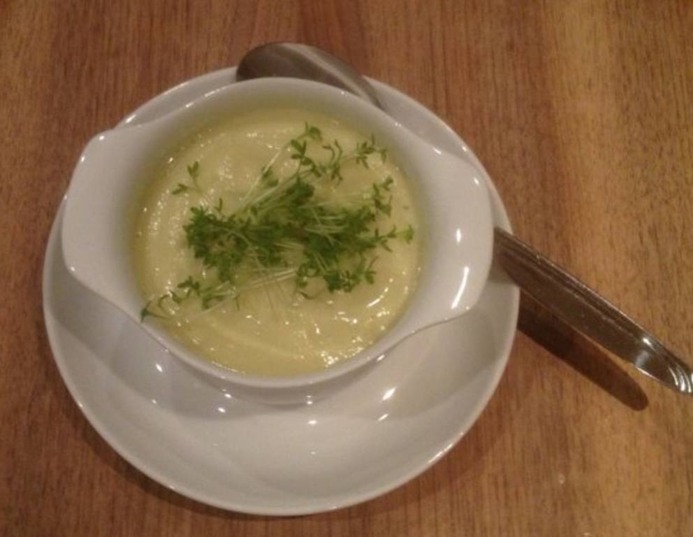 - Für die Karfiolsuppe mit Kresse den Karfiol in Rosen teilen und waschen. In leicht gesalzenem Wasser 15 Minuten garen. Anschließend pürieren.