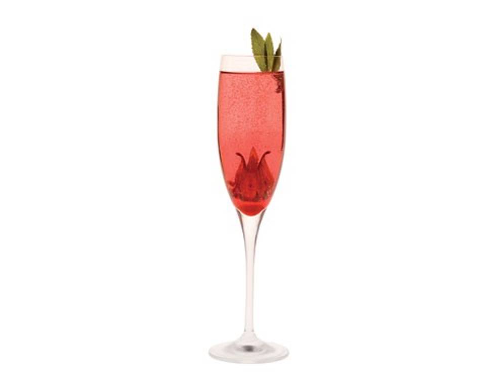 - Ein Minzblatt leicht zerdrücken und in ein Sektglas geben. Nun die wilde Hibiskusblüte in das Glas setzen und das Rosenwasser sowie noch etwas zerzupfte Minze zugeben. Zum Schluss mit Champagner aufgießen und mit einem Schuss Wild Hibiscus Sirup servieren.