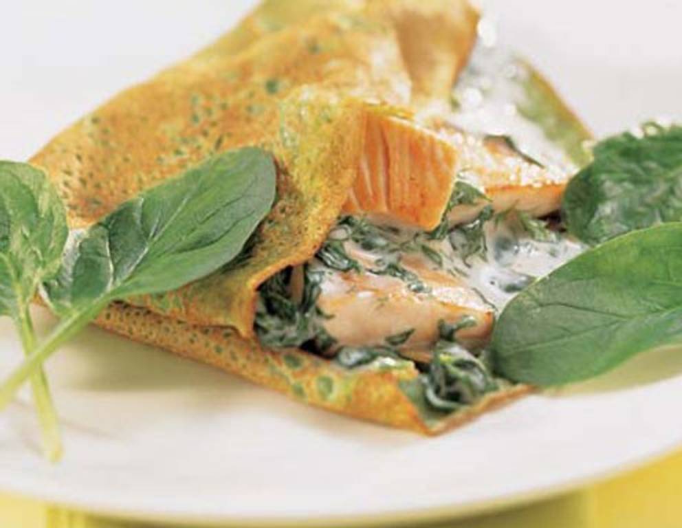 Spinatpalatschinken mit dem Lachsgemüse füllen und rasch servieren.