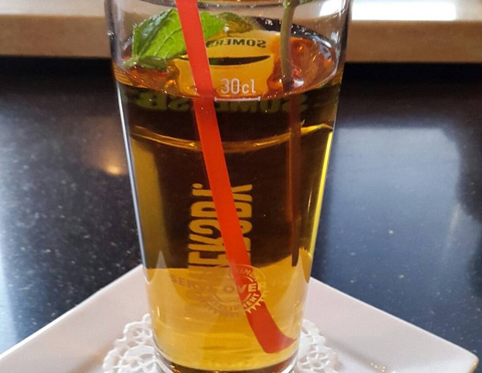- Den kalten Tee mit dem klaren Apfelsaft vermengen, kurz vor dem Servieren mit Sekt oder Mineralwasser aufgießen und den Früchte-Eistee mit frischer Minze mit Eiswürfeln, Limettenscheiben und Minze anrichten.