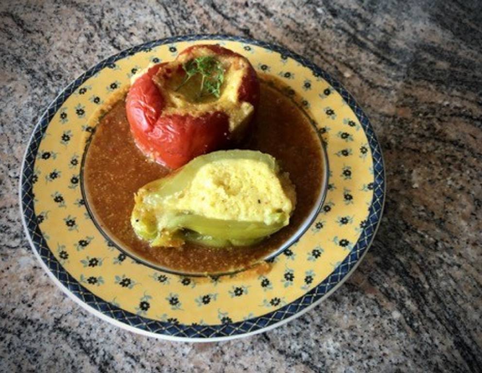 - Wasser mit dem Salz in einem Kochtopf aufwallen lassen. Den Maisgriess unter Rühren einrieseln. Unter durchgehendem Rühren so lange auf kleiner Flamme sieden, bis ein fester Brei entsteht. Den Kochtopf von dem Küchenherd nehmen. Die Paprikas der Länge nach halbieren, von Samen und Scheidewänden befreien und abspülen. An der Unterseite jeweils eine schmale Scheibe klein schneiden, damit die Hälften liegenbleiben. Den Herd auf 200 °C vorwärmen. Eine Gratinform mit Olivenöl auspinseln. Die Paradeiser abspülen, von Stielansätzen befreien, klein würfelig schneiden und in die Form geben. Mit Oregano, Salz und Pfeffer würzen. Die Paprikas mit der Polenta befüllen und auf die Paradeiser setzen.