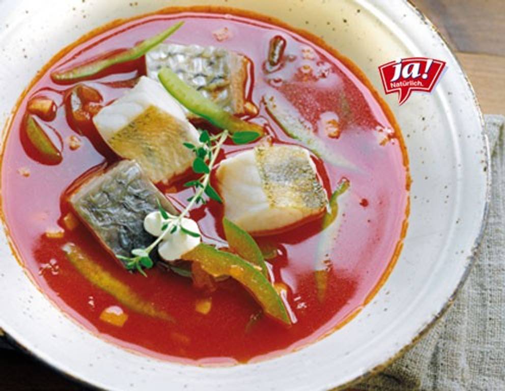 - Den Fischfond erwärmen. In der Zwischenzeit die Fischfilets, wenn nötig, entgräten und in nussgroße Stücke schneiden. Das Butterschmalz in einem hohen Topf zerlassen, kleingehackte Zwiebeln, würfelig geschnittenen Bauernspeck und streifenförmig geschnittene Paprikaschoten hinzufügen, Knoblauch darüberpressen und alles auf kleiner Flamme etwa 20 bis 25 Minuten durchziehen lassen und dabei mehrmals mit ein bis zwei Esslöffeln Fischfond aufgießen. Danach das Paradeisermark und das Paprikapulver einrühren, die Fischstücke (und, so vorhanden, die Karpfenmilch) dazugeben und mit den übrigen Zutaten in der Pfanne so verrühren, dass sich die Fische leicht rötlich färben. Mit dem heißen Fischfond aufgießen und die Fische im knapp am Siedpunkt köchelnden Sud fünf Minuten gar ziehen lassen. Die Fischstücke herausheben und gleichmäßig auf vier Tassen verteilen. Die Suppe noch einmal mit Salz und Paprikapulver abschmecken, über die Fischstücke gießen und mit jeweils einem kleinen Sauerrahmhäubchen möglichst heiß servieren.
