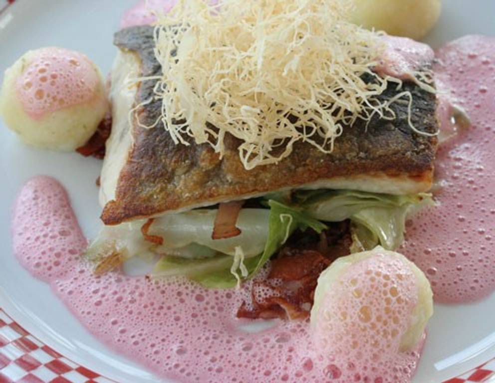 Kümmelstör auf gebratenem Spitzkraut mit Erdäpfel-Topfenknödel an Roter Rübensauce ist ein hervorragendes Fischgericht für den Winter.