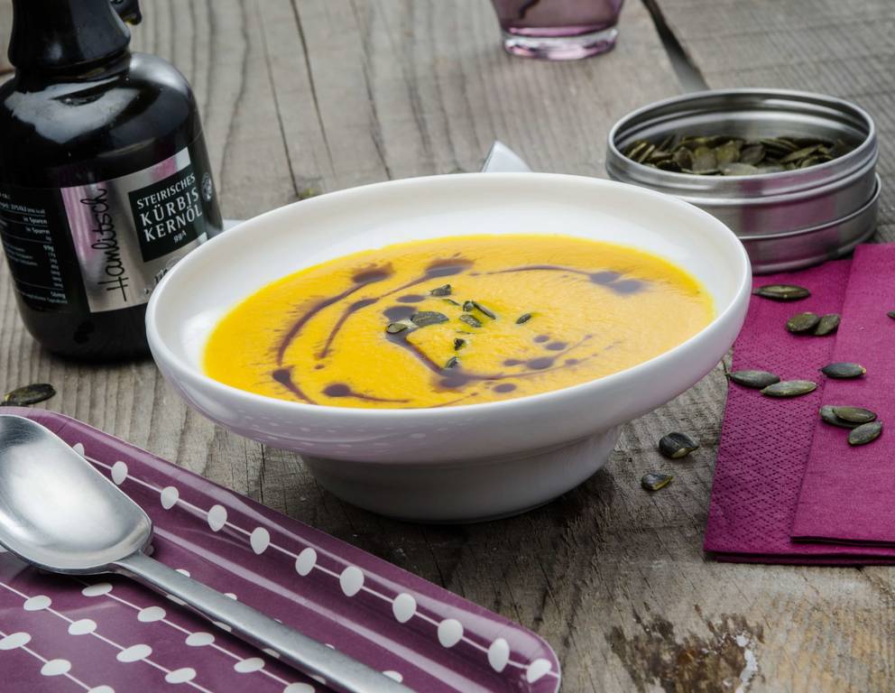 Besonders fein schmeckt die Kürbiscremesuppe, wenn man zum Schluss noch ein paar Tropfen Kürbiskernöl über die Suppe gibt.