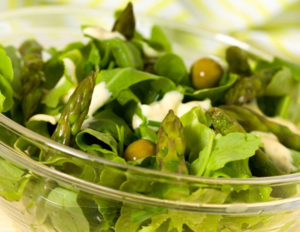 Statt Spargel kann man auch Schwarzwurzeln verwenden. Dieser Salat kann auch mit grünen Oliven abgeschmeckt werden.