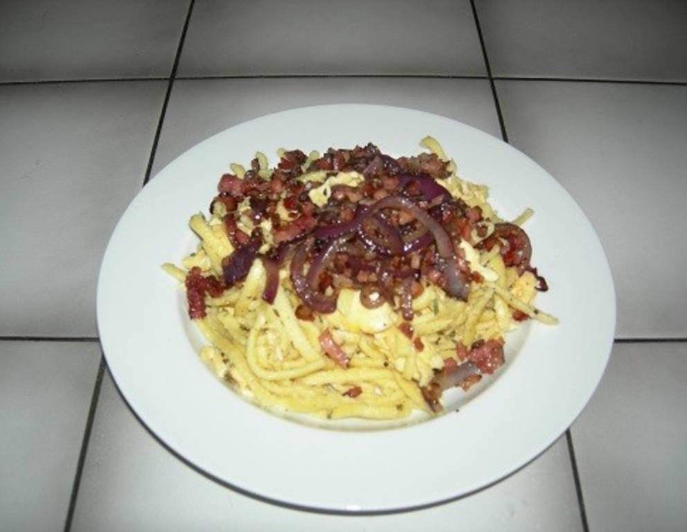 - Währenddessen die Spätzle mit einer Spätzlereibe oder einem Holzbrett in kochendes Salzwasser geben und ungefähr 2 Minuten köcheln lassen. Dann abseihen.