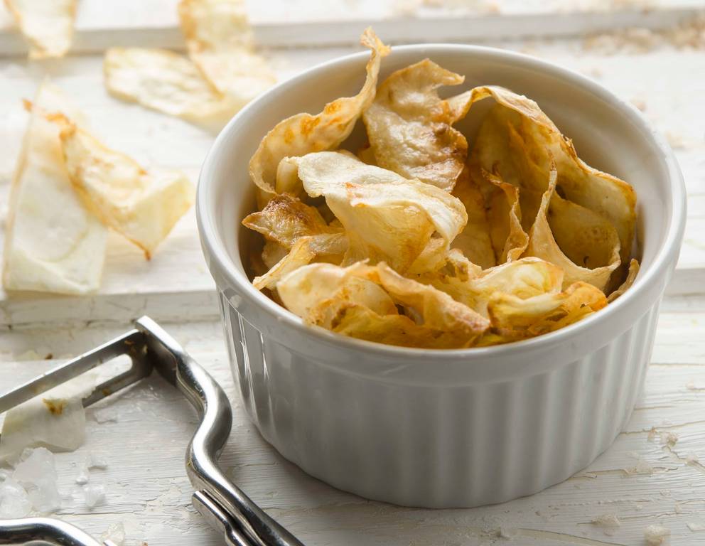 Man kann den gehobelten Sellerie auch vor dem Frittieren für 5-10 Minuten einsalzen, mit kaltem Wasser abspülen und gut abtrocknen. So wird dem Gemüse schon vorher Wasser entzogen und die Selleriechips werden knuspriger.