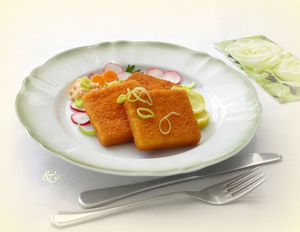 Zu den panierten Fischfilets passen Kartoffelsalat, oder Reis bzw. Petersilkartoffeln mit grünem Blattsalat.