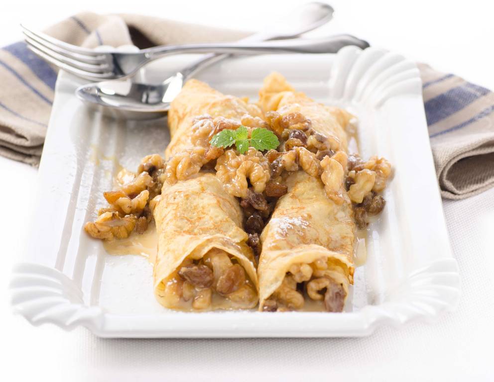 - Für die Fülle das Schlagobers leicht erwärmen (nicht kochen!) und die Nüsse, den Honig, die Rosinen und den Rum hineinrühren.