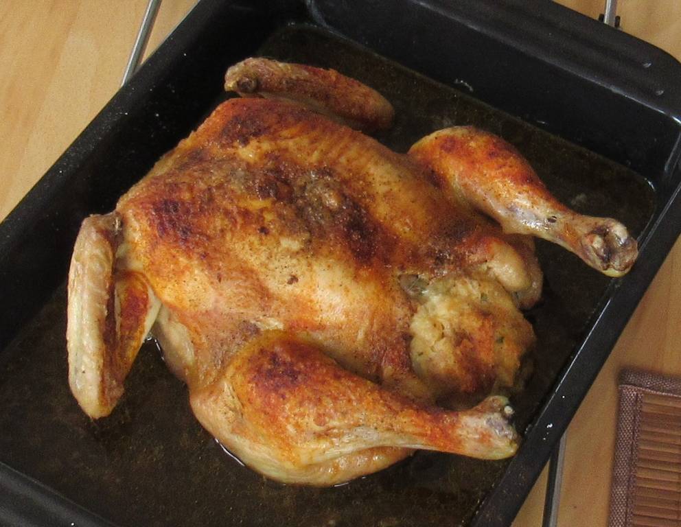 - Den Bräter auf die zweite Leiste von unten in den Backofen schieben. Die Temperatur auf 200 °C herunterschalten und das Huhn im offenen Bräter 1 1/4 Stunden rösten. Bei Umluft nach 1 Stunde noch ein 1/8 Liter Wasser zugießen.