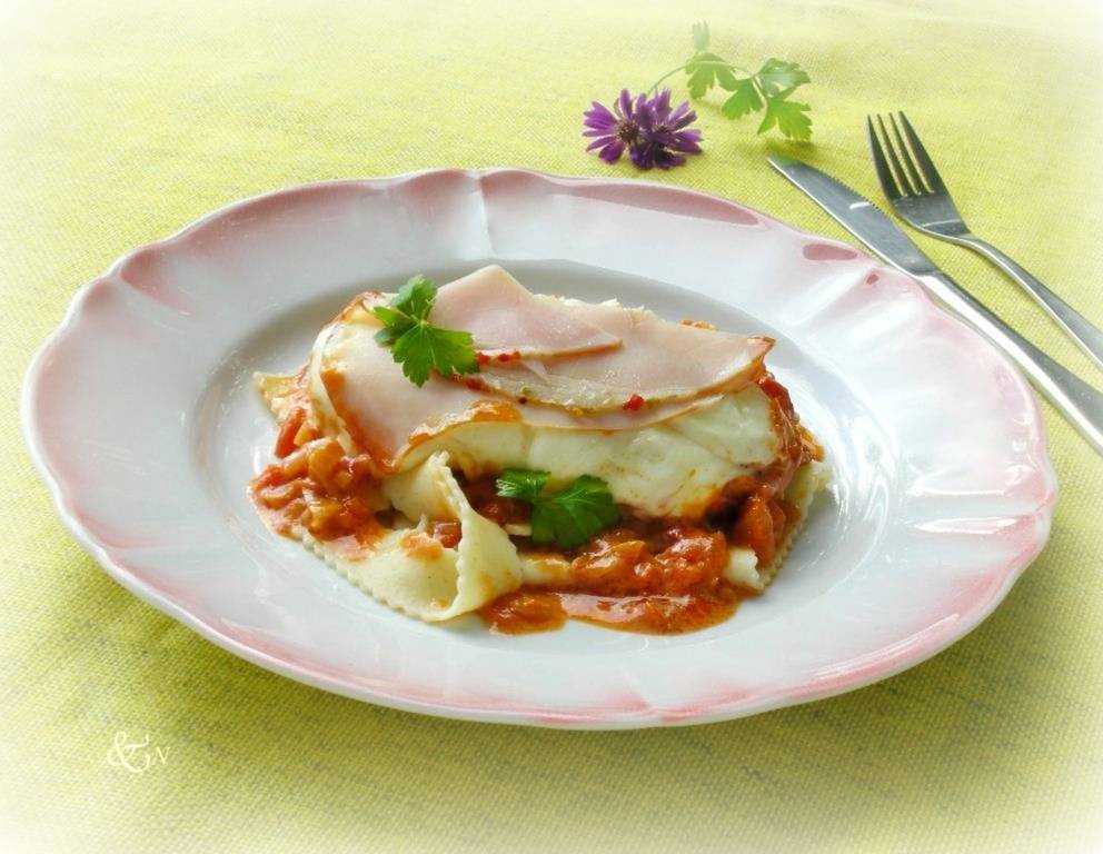 - Währenddessen den Mozzarella in Scheiben schneiden. Das angebratene Fleisch damit "zudecken" und zuletzt den Schinken drauflegen.