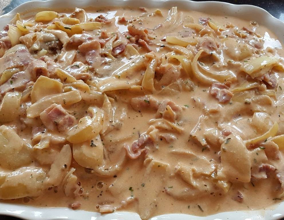 - Die Stücke in eine Gratinform legen. Die in Ringe geschnittenen Zwiebeln darüber geben, die Beutelzwiebelsuppe darüberstreuen und die Form mit dem Schlagobers aufgießen.