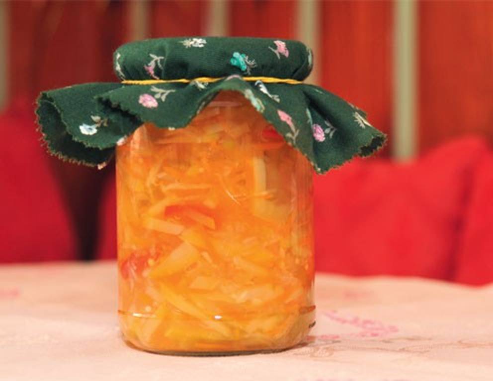 Aus 1 l Essig, 3/8 l Wasser, Salz, Zucker, 3 Lorbeerblättern, einigen Senf- und Pfefferkörnern einen Sud kochen (10 Minuten). Dann Karotten, Sellerie (5 Minuten), Paprika, Zwiebeln (weitere 5 Minuten) und zuletzt Zucchini beigeben und alles zusammen nochmals 10 Minuten weiter kochen lassen. 1 ½ Päckchen Einsiedehilfe in die heiße, aber nicht mehr kochende Masse einrühren. - Den fertigen Zucchinisalat heiß in Gläser füllen und gut verschließen.