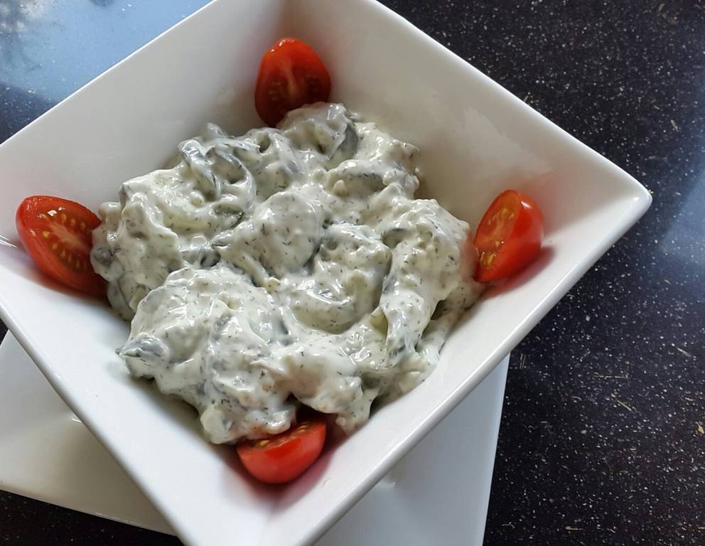 - Abschmecken und den gehackten Dill hinzufügen. Den Gurkensalat abgießen und den Salat mit dem Dillobers vermengen.