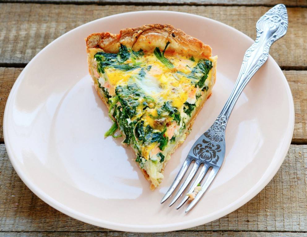 Lachsfilet in etwa 3 cm große Würfel schneiden, zum Blattspinat hinzugeben und die Masse anschließend auf dem Teig verteilen. Eier mit Cremefine gut verquirlen, mit Salz, Pfeffer und Muskat abschmecken und über die Quiche-Füllung gießen.