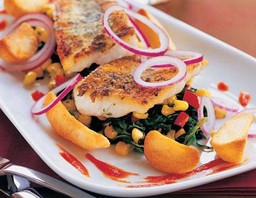 Für das Gemüse Zwiebel und Knoblauch in Butter anschwitzen. Mais und Blattspinat zugeben und mit 80 ml Wasser aufgießen. Gemüse mit Salz, Pfeffer und Muskat würzen und unter Rühren erhitzen.