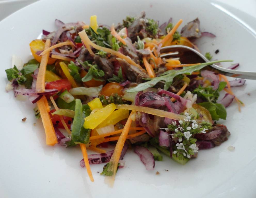 - Das Bratenfleisch mit den übrigen Zutaten mischen. Das Dressing darüber träufeln.