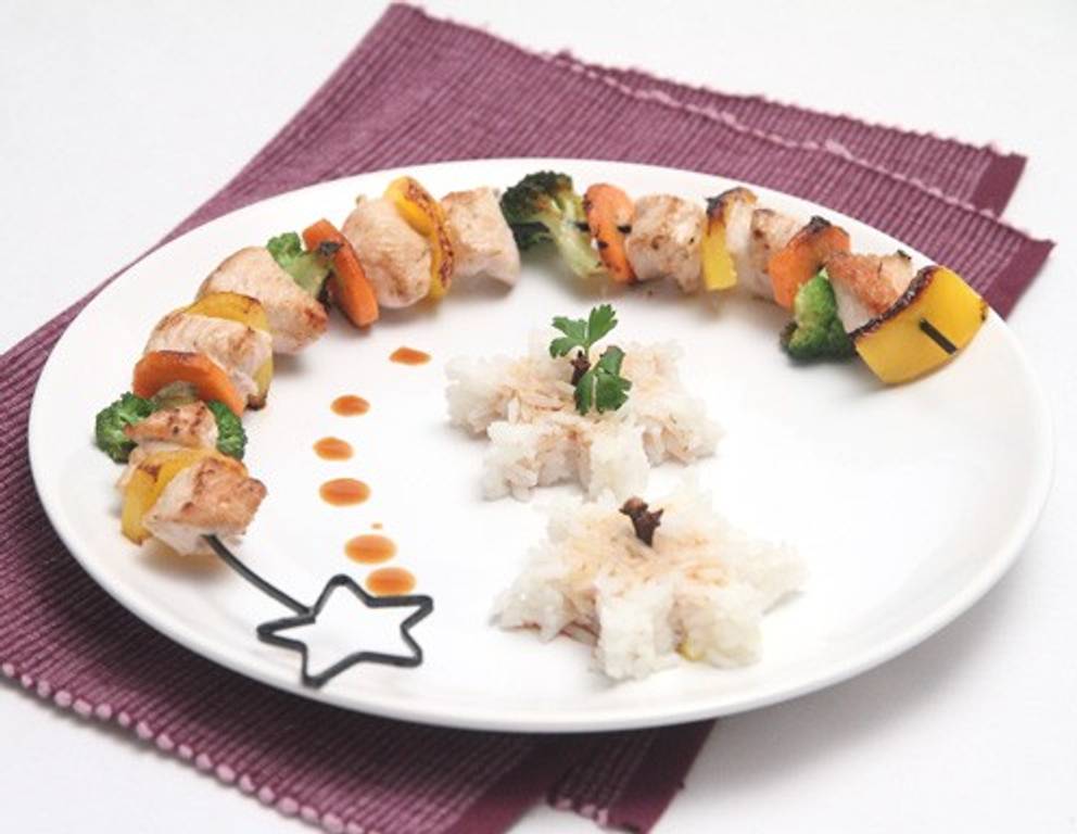 Die Hühnerspieße nun nach Wunsch und Laune mit den Hühnerstücken, Karottenscheiben, Paprikawürfeln und Brokoliröschen bestücken. - Das Olivenöl in einer Pfanne erhitzen. Die Spieße auf beiden Seiten einige Minuten braten, bis das Hühnerfleisch nicht mehr glasig ist. Die Hühnerspieße mit der weihnachtlichen Sauce und Reis servieren.