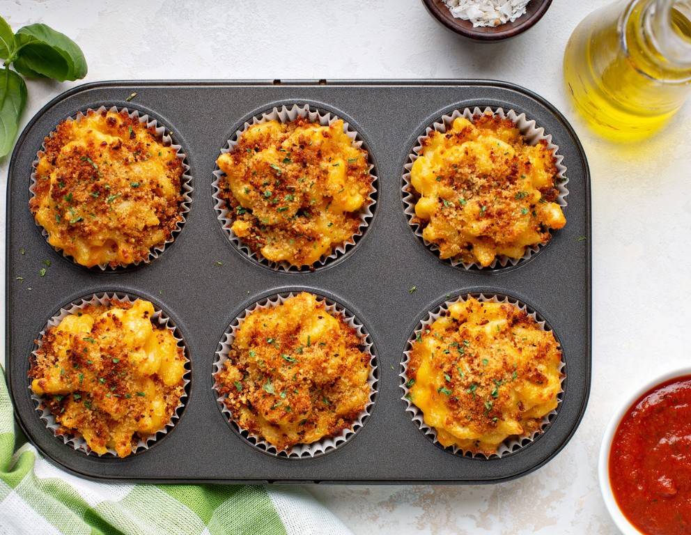 - Dieses Gemisch in die 12 Mulden füllen, mit dem Käse überstreuen und im vorgeheizten Rohr bei ca. 160 °C backen (ca. 30 Minuten bzw. bis die Nudelmuffins goldbraun sind).