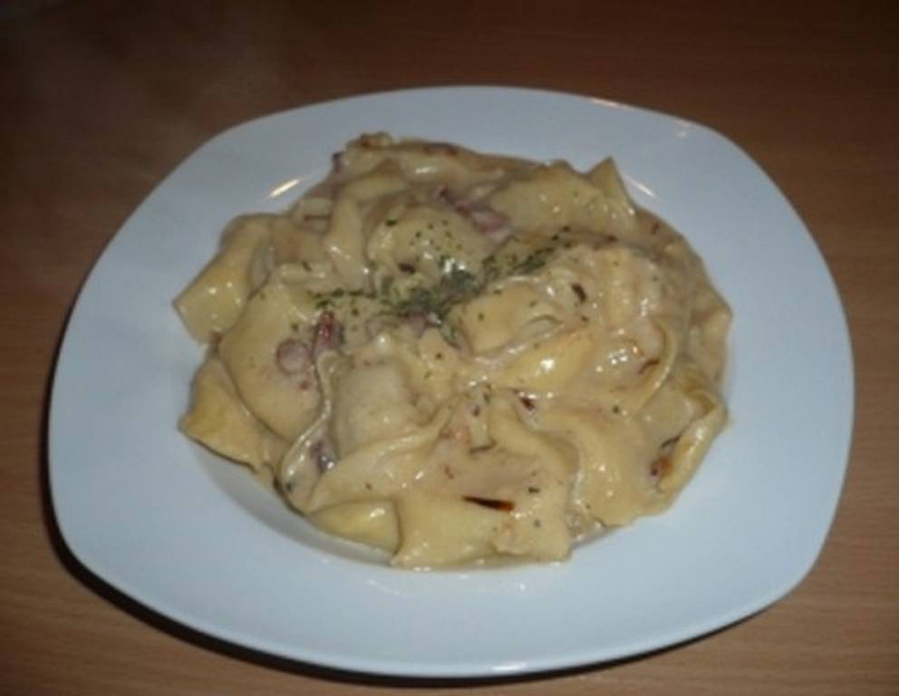 - Sauce zu dem Speck und den Zwiebeln in die Pfanne geben, Tortellini unterrühren und fertig.