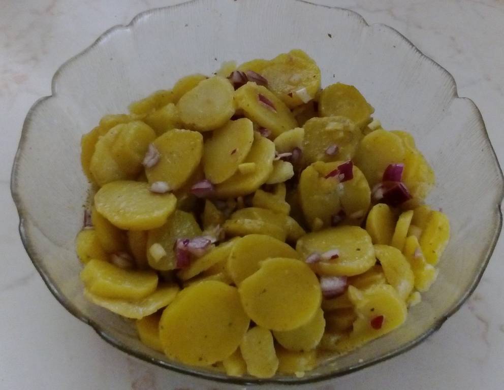 Achtung: Je nach Essigsorte kann diese Masse zu groß sein. In diesem Fall den Kartoffelsalat mit Suppe oder evtl. Wasser verdünnen.