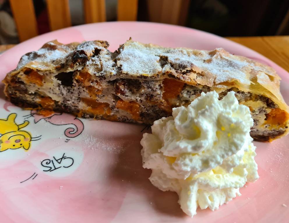 - Als erstes die Ricotta-Mohn-Füllung, dann die Aprikosenstücke auf der oberen Teighälfte des ausgezogenen Strudelteiges gleichmäßig verteilen, die Seiten einwickeln und den Strudel mittelsdes Tuches zusammenrollen. Mit der Verschlussseite nach unten auf ein Backblech geben. Mit dem übrigen Eidotter bestreichen.