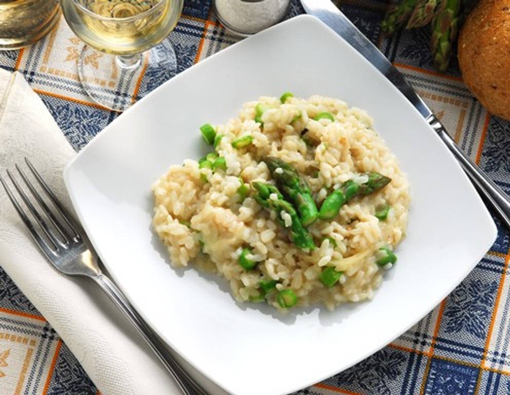 Den gewaschenen Reis in einen geschlossenen Garbehälter geben mit Wein, Gemüsefond und Salz mischen.
