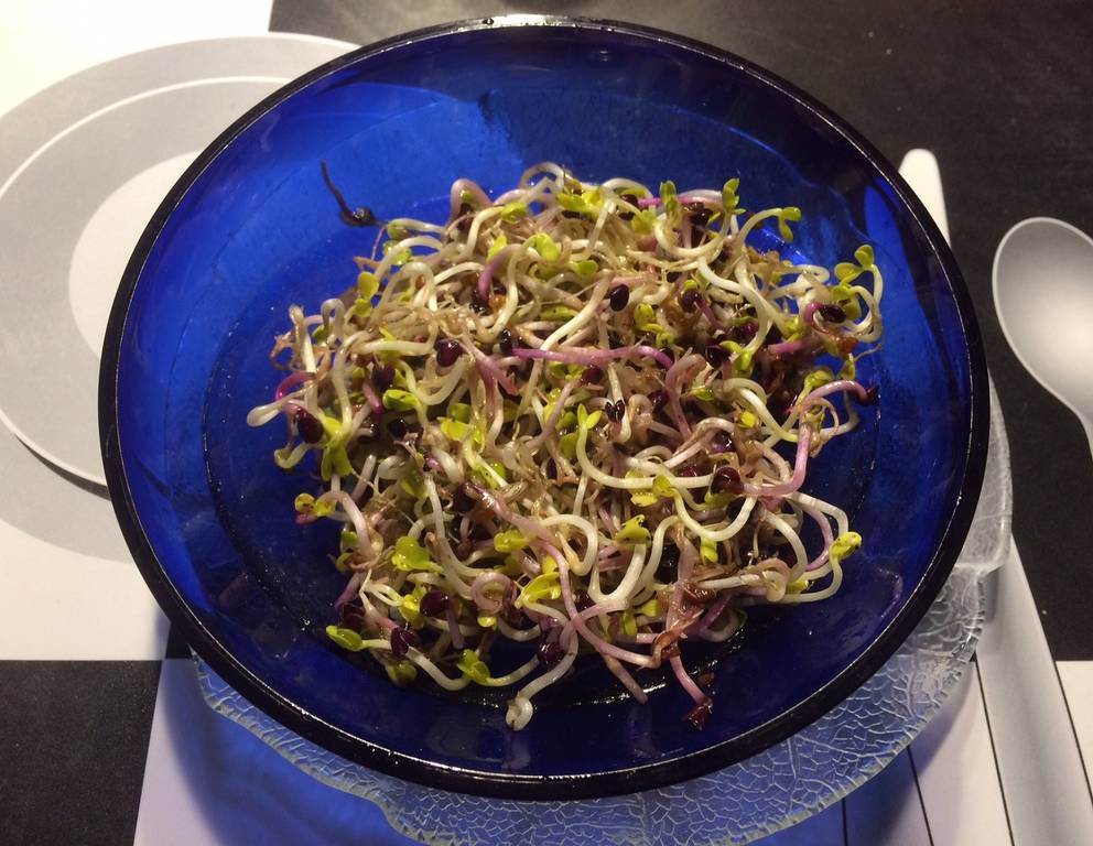 - Die Sprossen und die Keime gut abschwemmen und abrinnen. Mit Apfelessig, Rohrzuckermelasse, Meersalz, Saft einer Zitrone, Öl und Gemüsefond einmarinieren.