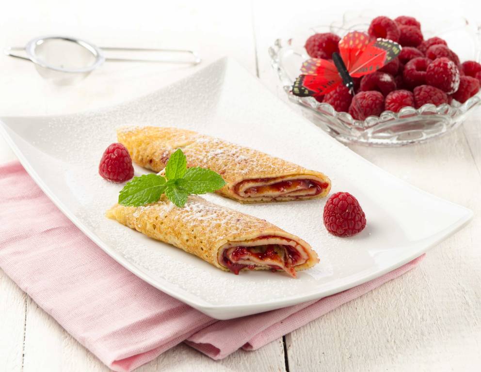 - Die Palatschinken mit der Himbeermarmelade bestreichen und einige der halbierten Himbeeren sowie etwas von den gehackten Minzblätter darauf platzieren. Die Himbeer-Palatschinken einrollen und mit einem Minzblatt dekoriert servieren.