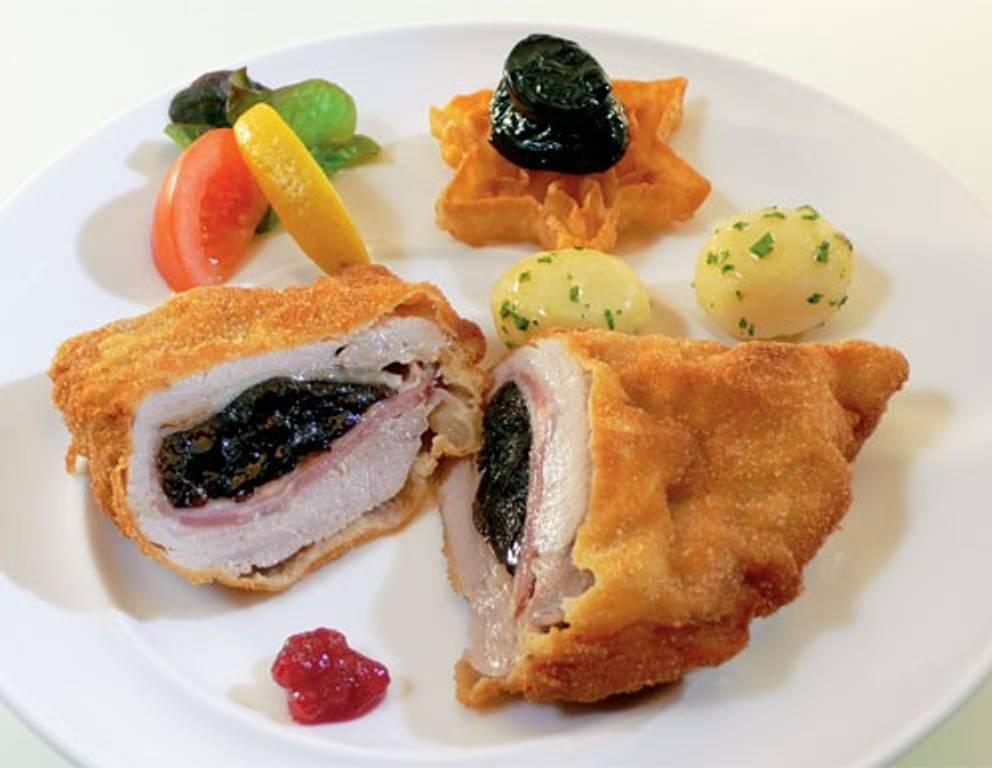 Besonders gut mundet dieses Schnitzel, wenn man den Bauernspeck durch Rohschinken (Prosciutto) ersetzt, wie er beispielsweise von Johann und Renate Winter aus Pfaffstätt ohne Stabilisatoren in speziellen Reiferäumen hergestellt und ohne Knochen 7–8 Monate und oft auch noch länger gereift wird. Als kongenialer Käse eignet sich dazu beispielsweise ein Gmundner Berg Premium, der mindestens sechs Monate gereift wurde und zu den „Vorzeigekäsen“ der auch international vielfach (u. a. auch als Käse- Weltmeister und „Käse-Kaiser“) ausgezeichneten Gmundner Molkerei (Gmundner Milch) zählt. Die Gmundner Käsetradition reicht bis ins Mittelalter zurück, als Traunseer Bauerngüter nachweislich bereits 1390 ihren Zehent in Käselaiben zu leisten hatten. Die „Molkereigenossenschaft Traunsee“, aus der die heutige „Gmundner Milch“ hervorging, wurde 1931 gegründet.