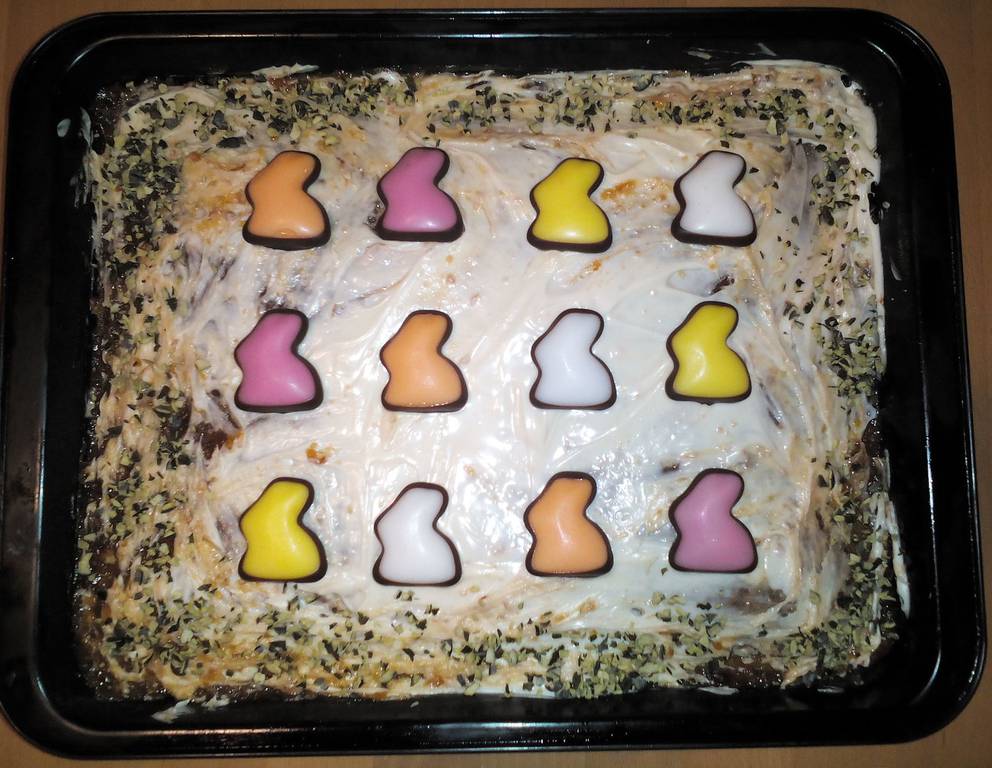 Wenn Sie es noch schokoladiger mögen, können Sie den Oster-Schokoladenkuchen auch mit Schokoladenglasur statt Zuckerglasur überziehen.