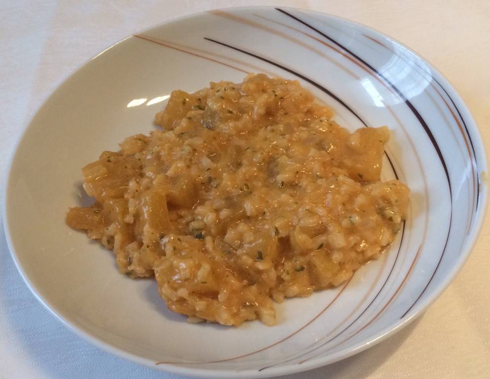 - Den Kochtopf von dem Feuer nehmen, mit Salz und Pfeffer würzen, Rahm und Käse dazugeben. Alles miteinander mischen, den Kochtopf abdecken und drei Minuten stehen lassen. In einer gewärmten, tiefen Backschüssel anrichten. Das Kürbisrisotto mit Petersilie oder Schnittlauch überstreuen.