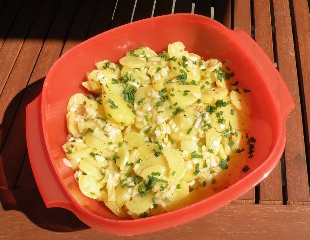 - Essig und Dotter mixen und zu den Erdäpfeln geben. 5 El Sonnenblumenöl oder anderes Pflanzenöl gleichmäßig darüber verteilen. Schnittlauch klein schneiden und gemeinsam mit den restlichen gehackten Zwiebeln hinzfügen.