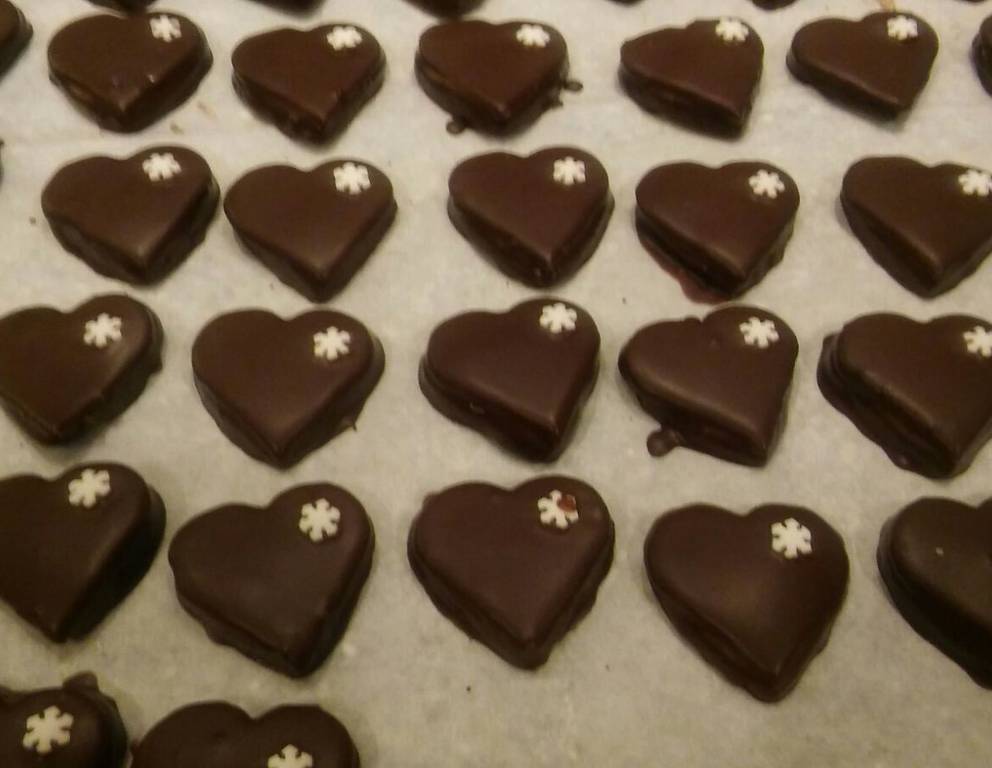 - Mehl, Zucker und Vanillezucker auf die Fläche sieben. Mit dem Ei und der kalten Butter zu einem Knetteig zubereiten. Diesen zwischen zwei Lagen Frischhaltefolie dünn auswalken und kleine Herzen ausstechen. Auf Pergamtenpapier bei vorgeheiztem Herd bei 200 °C 5 bis 10 Min. backen. Nach dem Erkalten dünn mit Aprikosenmarmelade bestreichen. Marzipan mit Staubzucker zusammenkneten, dünn auswalken und ebenfalls Herzchen ausstechen. Die Kekse damit belegen. Mit Kochschokolade, die im Wasserbad aufgeweicht wurde, überziehen und mit jeweils einer Walnusshälfte verzieren.