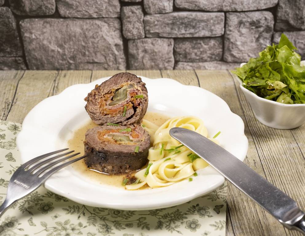 Die Rindsrouladen mit Bandnudeln können auch im Druckkochtopf zubereitet werden. Auf diese Weise verringert sich die Garzeit.