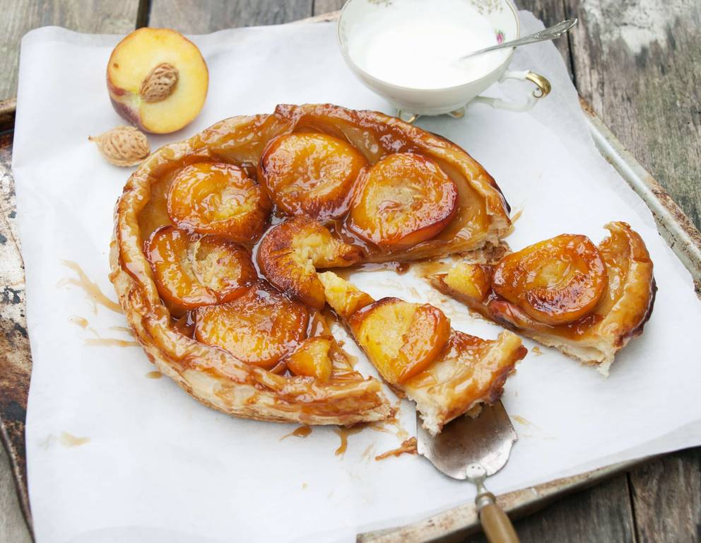 Einfache Tarte Tatin mit Pfirsichen kann auch mit Birnen zubereitet werden.