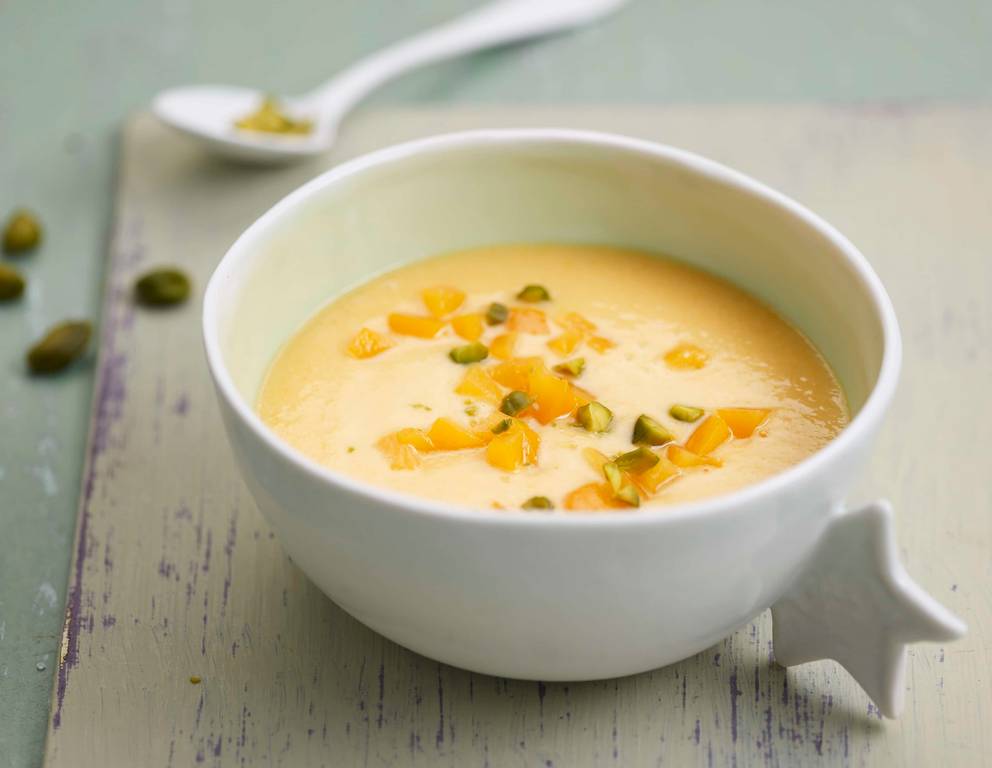 - Das Pfirsich-Buttermilchmousse mit den gehackten Pistazien bestreut servieren.