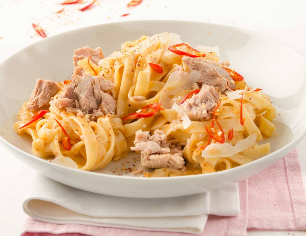- Den Parmesan fein hobeln. Die Nudeln zur Sauce geben, portionieren und die Bandnudeln mit Thunfisch und Chili mit dem Parmesan bestreut servieren.