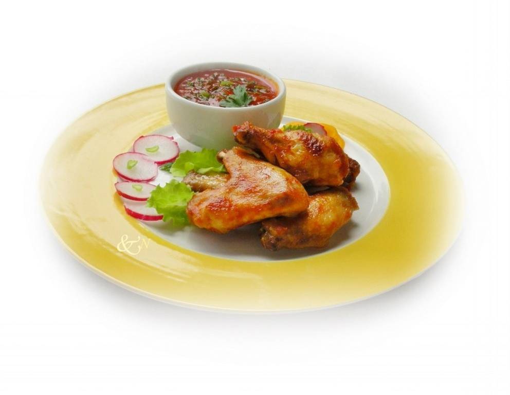 - Für die Marinade Tomatenketchup mit Tabasco, Limettensaft, Paprikapulver, Essig, 1 Prise Salz und Oregano durchrühren. Die Hühnchenflügel ganz mit der Marinade bedecken, mit Frischhaltefolie abdecken und 24 Stunden im Kühlschrank einmarinieren lassen.