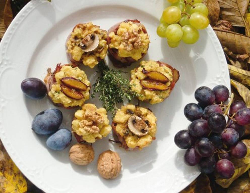 - Rehmedaillons mit Küchengarn rund binden, damit sie eine gute Form behalten. Mit Salz, Pfeffer und Thymianblättchen würzen und von allen Seiten in heißem Butterschmalz anbraten. Toastbrotwürfel mit Salz, Pfeffer und Muskatnuss würzen und mit Ei und Milch nach Bedarf zu einem Semmelteig verarbeiten (wie für Semmelknödel). Semmelmasse auf über die halbgaren Medaillons kreisförmig verteilen, in die Mitte Zwetschken-, Walnuss-, Schwammerlhälften oder Birnenspalten legen.