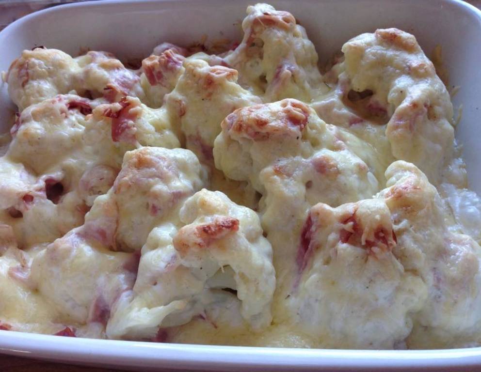 - Für das Karfiolgratin den Karfiol in Rosen teilen, in Salzwasser knapp gardünsten und abschütten. In eine ausgebutterte Gratinform geben.