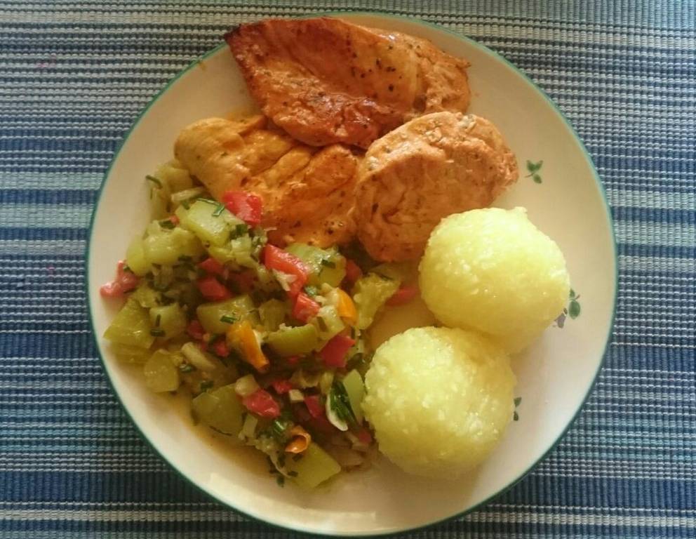 - 2. Zugedeckt im aufgeheizten Herd bei 180 °C  auf der 2. Schiene von unten 40 Min. gardünsten (Gas 2-3, Umluft bei 160 °C  ). Zucchini reinigen und würfelig schneiden. Weisse Bohnen abschütten, alles zusammen mit 200 ml Geflügelfond nach 20 Min. mit in den Bräter Form und offen weiter gardünsten. Sauce mit Salz, Pfeffer und Paprikapulver nachwürzen und alles zusammen anrichten.