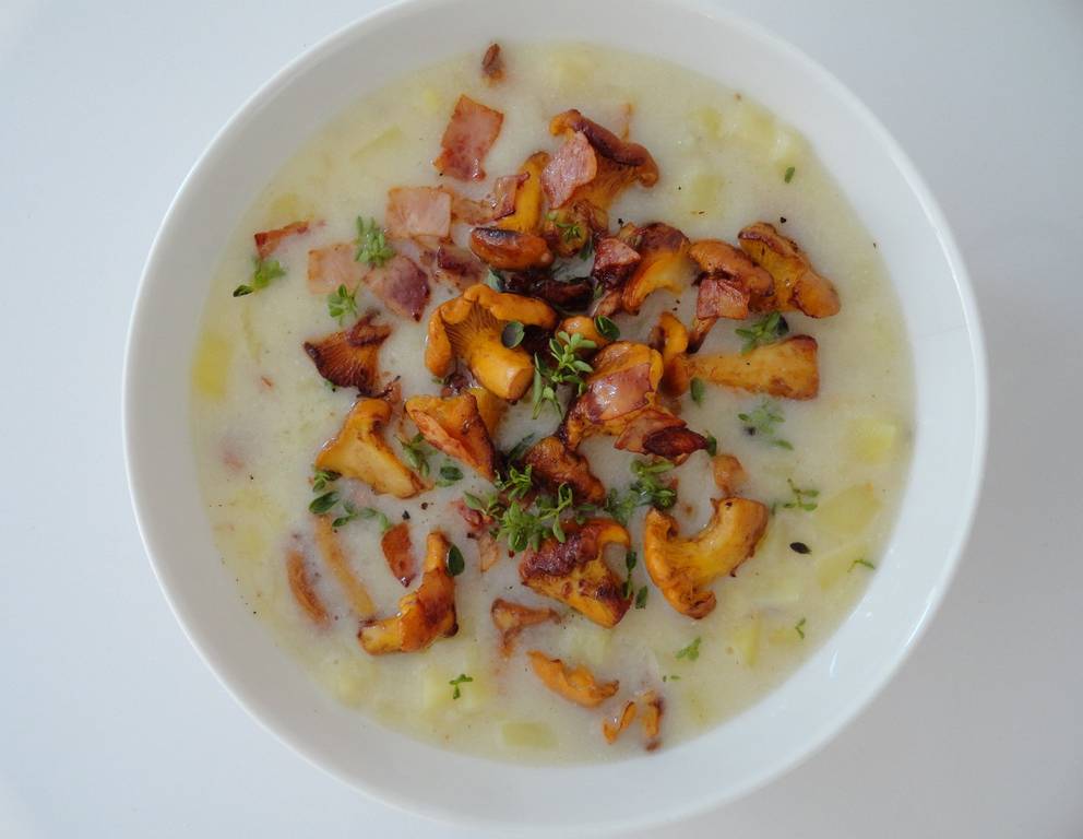Version ohne Thermomix: Suppengemüse und Frühlingszwiebeln fein würfeln. 2 EL Pflanzencreme in einem Topf erhitzen, Gemüse und die Hälfte Eierschwammerln darin andünsten. Kartoffeln 1 l Wasser, Suppenwürfel, Lorbeerblätter, Salz, Pfeffer und Zucker zugeben und ca. 20 Minuten garen. Schinkenwürfel und restliche Eierschwammerln in der übrigen Pflanzencreme in einer Pfanne anbraten. 2/3 der Suppe aus dem Topf nehmen, den Rest fein pürieren. Die restliche Suppe wieder zurück in den Topf geben und unterrühren. Suppe mit Schinkenwürfeln und Eierschwammerln bestreut servieren.