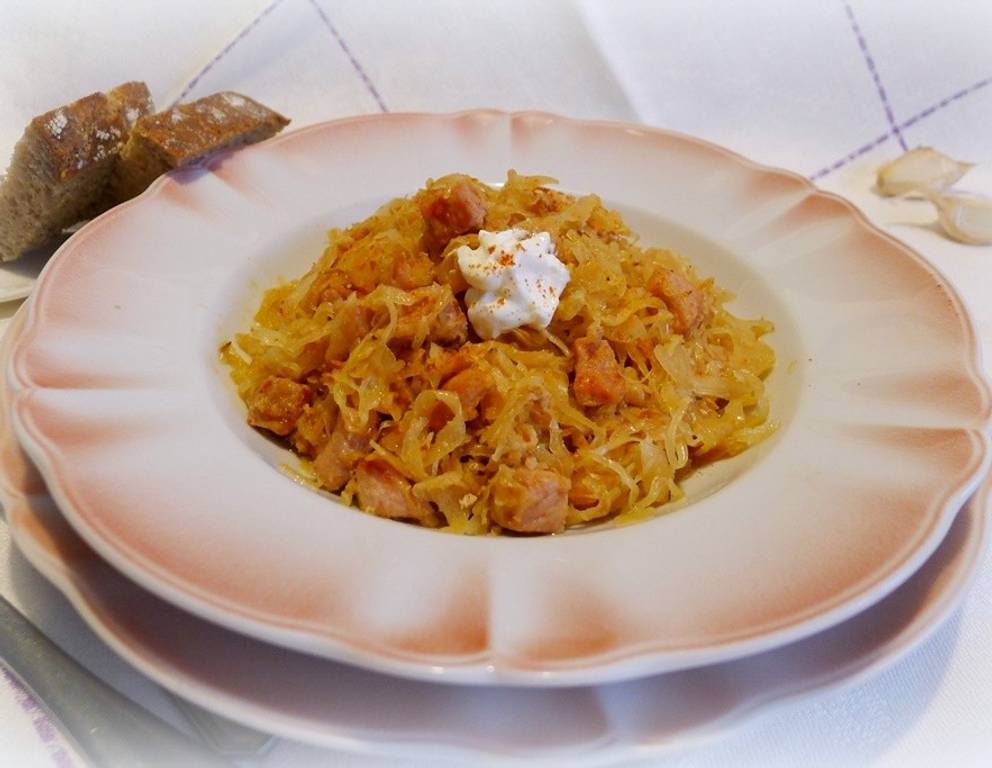 - 2. Sauerkraut dazugeben. Mit Pfeffer, Salz, Kümmel und Paprikapulver würzen. Zugedeckt bei mittlerer Hitze 8 min gardünsten. Fleisch nach 5 min Zugeben. Evtl. Nachwürzen. Mit Thymian bestreut zu Tisch bringen. Dazu passt Schnittlauch-Sauerrahm.