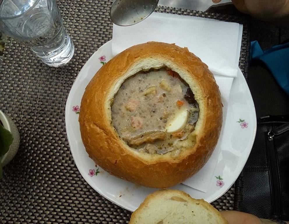- Porree reinigen, abspülen und nur das Weiße und Hellgrüne in feine Streifen schneiden. Durchwachsenen Speck ebenfalls in feine Streifen schneiden und mit dem Porree in der übrigen Butter unter Wenden anbraten. Thymian in die Suppe geben. Die Suppe in die Brotlaibchen füllen. Speck und Porree auf der Erdäpfelsuppe im Brot gleichmäßig verteilen.