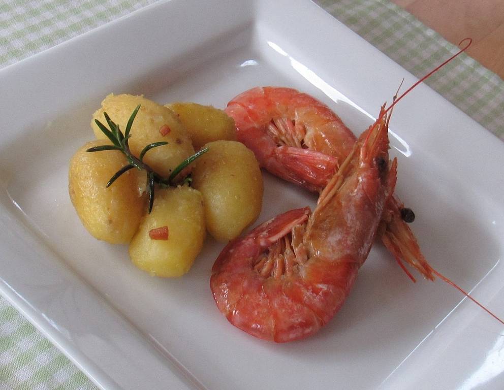 - Die Scampischwänze hinzfügen und unter mehrmaligem Wenden drei bis vier min rösten; das Scampifleisch darf nicht mehr glasig, sondern muss weiß sein.