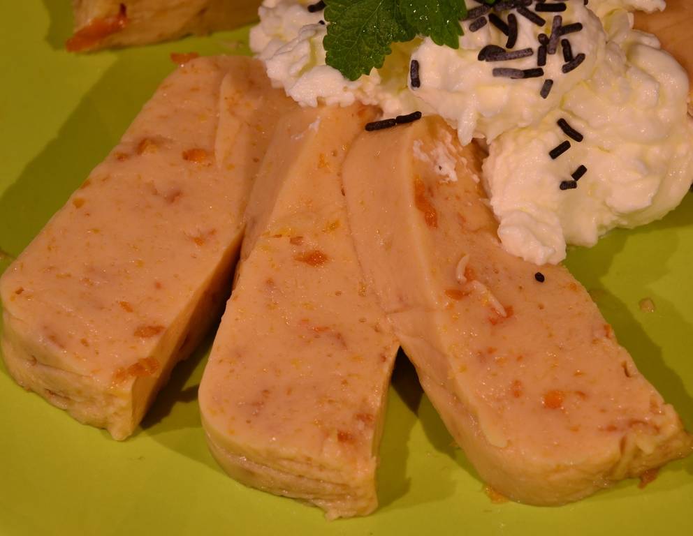 - Eine Kastenform (1 Liter Inhalt) mit Frischhaltefolie ausbreiten, die Menge hineinfüllen und mindestens 6 Stunden einfrieren.