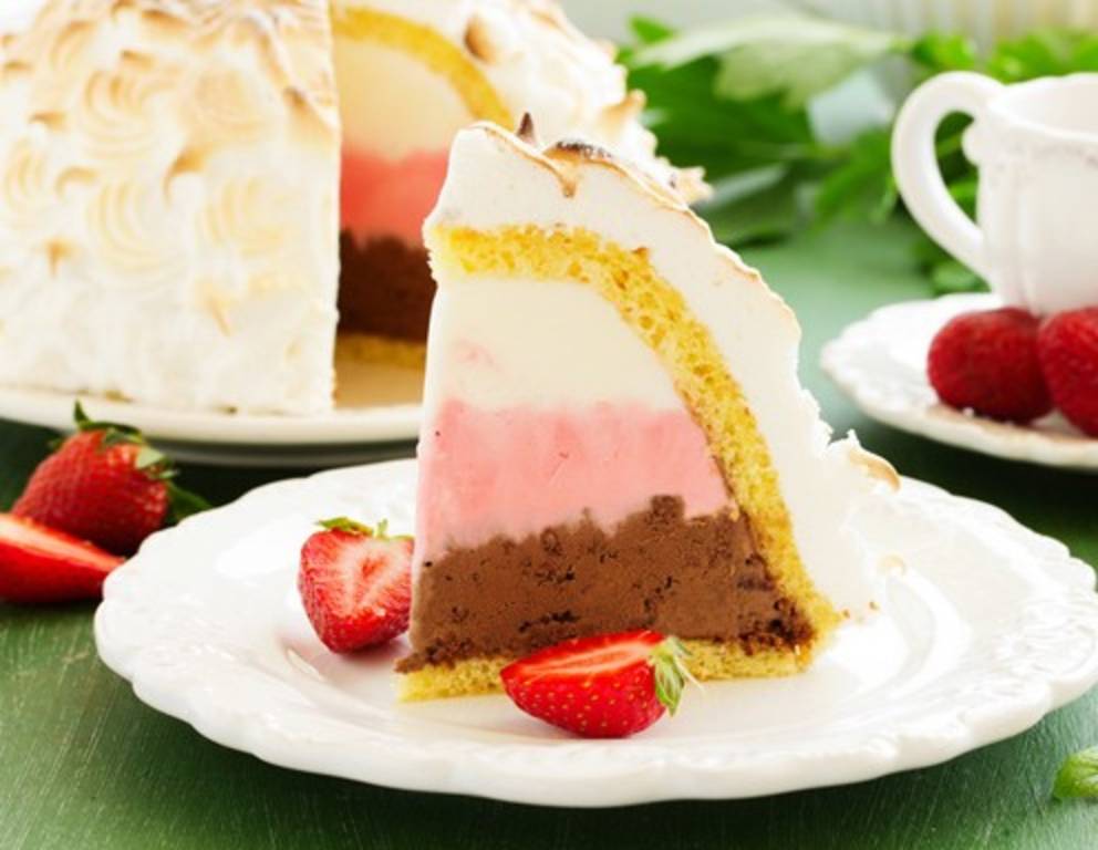 - Das Eis Ihrer Wahl, direkt aus der Tiefkühlung, auf den Boden verteilen. Verwenden Sie am besten die Eisvarianten, die im Block verpackt sind. Dieses Eis können Sie mit einem heißen Messer am besten in die gewünschte Form schneiden. Am schönsten schaut Baked Alaska aus, wenn Sie unterschiedliche Eissorten verwenden.