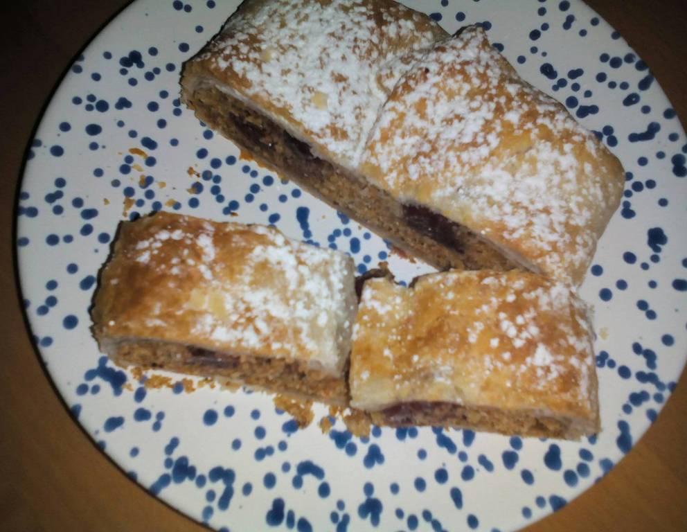 - Den Kirschstrudel nach dem Backen mit der übrigen Butter bestreichen, abkühlen und mit Vanille-Staubzucker bestäuben.